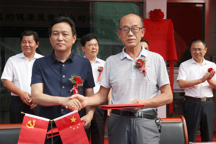 霍山縣醫(yī)院院長潘家東、迎駕慈善基金會副理事長黃必義進(jìn)行簽約。李玉武、倪永培共同為“迎駕光明行”復(fù)明項目揭牌。