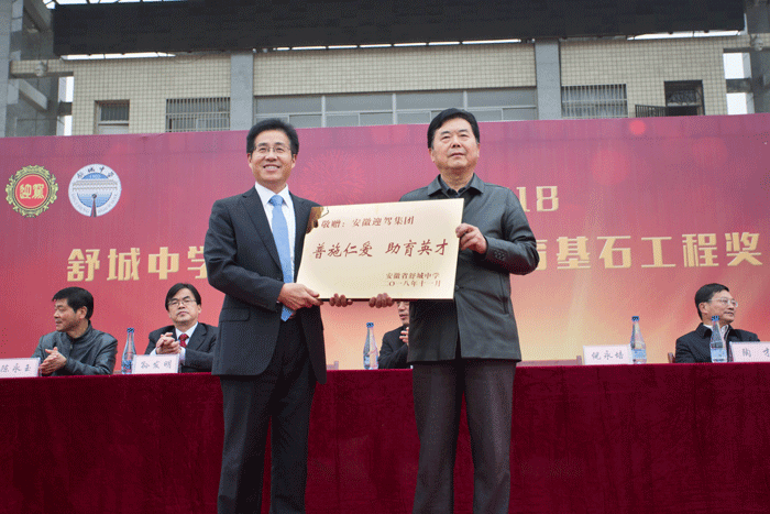 大會現(xiàn)場,39名班級管理工作突出的班主任和教學成績突出的老師,以及100名家庭貧困、品學兼優(yōu)的學生獲得了表彰。為表達感謝之情,舒城中學向迎駕集團贈送了“普施仁愛 助育英才”的牌匾。