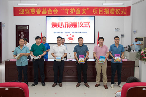 儀式上,迎駕慈善基金會(huì)向東西溪、大化坪、上土市等10所學(xué)校的師生代表捐贈(zèng)了“素質(zhì)教育——守護(hù)童安”系列圖書和學(xué)生安全書包。