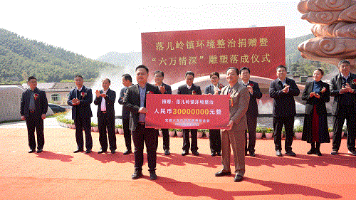 四月的山口明珠落兒嶺艷陽高照,總高19.8米的“六萬情深”雕塑在陽光的映襯下更加光彩奪目。霍山縣人大常委會主任尹如江,縣政協(xié)主席張潤之,縣委常委、常務(wù)副縣長李傳江,迎駕貢酒股份有限公司董事長倪永培共同為“六萬情深”雕塑揭幕。儀式上,迎駕慈善基金會理事長張平代表基金會向落兒嶺鎮(zhèn)環(huán)境整治捐款3000萬元。