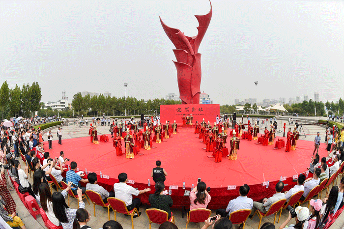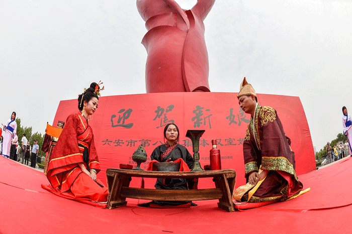 “關(guān)關(guān)雎鳩,在河之洲。窈窕淑女,君子好逑……”9月20日,在悠揚(yáng)的古樂聲中,六安市第八屆“迎駕新娘”集體婚禮在皋城廣場隆重舉行。20對新人穿上漢服、行漢禮、奏漢樂,上演了一場別具一格的漢式婚禮。