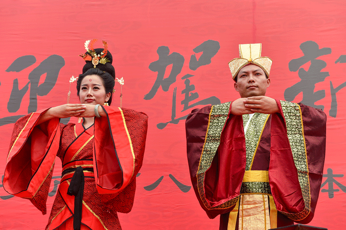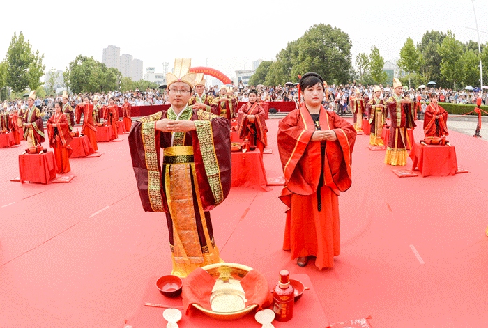 “良辰吉時,佳偶天成;執(zhí)禮者各執(zhí)其禮,執(zhí)事者各執(zhí)其事。掌燈!新人入場?!卑殡S著莊嚴(yán)的古典喜樂,20對新人身著漢式婚禮袍服,腳踏紅毯,在贊禮官帶領(lǐng)下,優(yōu)雅而莊重地步入典禮現(xiàn)場。隨著贊禮官的引導(dǎo),新人們逐次完成了祈愿禮、三拜禮、對席禮、沃盥禮、同牢禮、合巹禮、執(zhí)手禮、解纓佩授禮等禮節(jié)。最后,隨著贊禮官宣布“禮成”,全體新人答謝賓朋,成為結(jié)發(fā)夫妻。整套禮儀逐一演繹,再現(xiàn)中華傳統(tǒng)漢婚古儀,讓新人們充分體會刻骨銘心的愛戀。