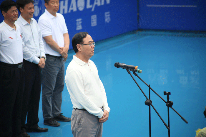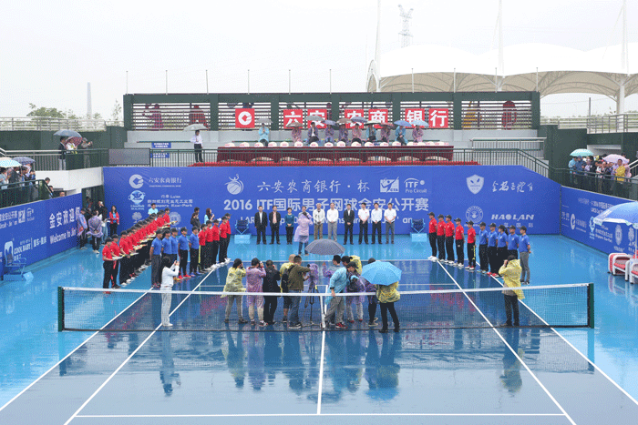 金安區(qū)委書記汪龍照致開幕詞,安徽籍球員惠天翔代表參賽球員宣誓,曾微作為裁判代表宣誓。上午10點,畢小彬宣布2016ITF國際男子網球金安公開賽開幕。