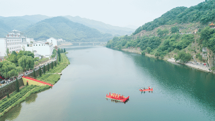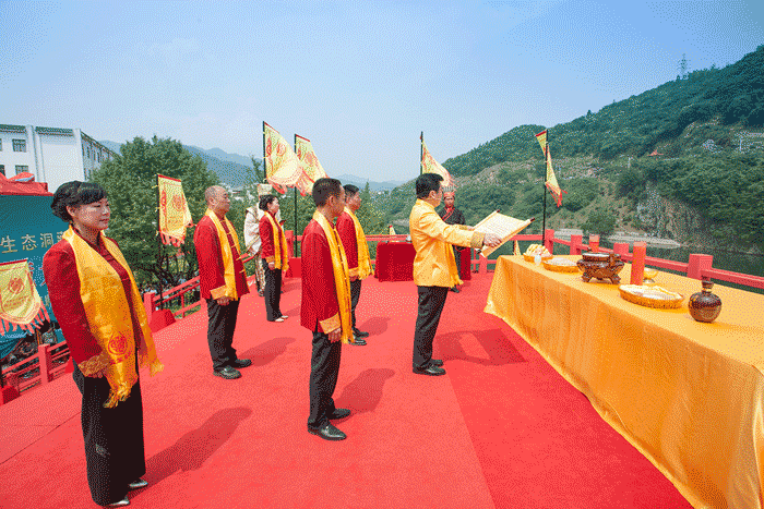 在洪亮的“起酒”聲中,迎駕釀酒大師團隊乘竹排橫跨淠河,護送9壇珍貴原酒進入黃巖洞,以剮水行洗塵禮正式封藏入洞。
