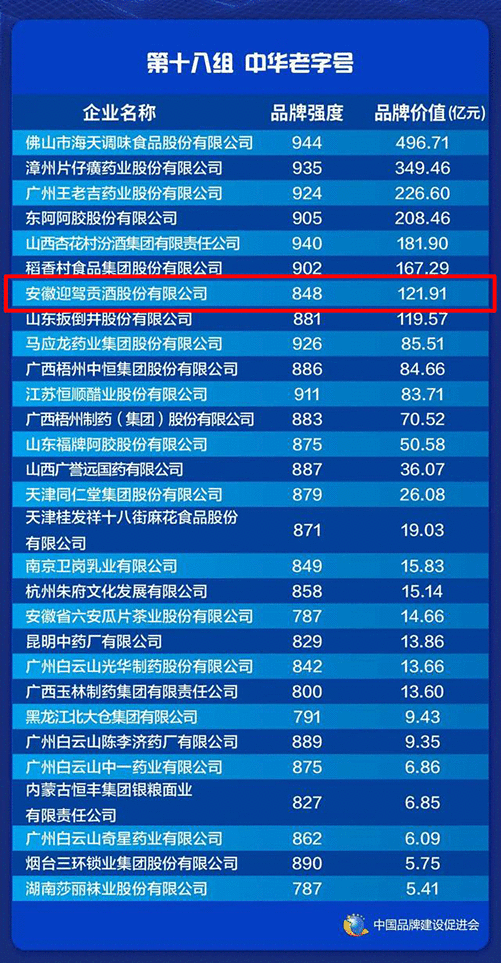 5月9日,值我國第五個中國品牌日之際,新華社、中國品牌建設(shè)促進會、中國資產(chǎn)評估會、國務(wù)院國資委新聞中心等單位聯(lián)合發(fā)布了2021中國品牌價值評價信息,迎駕貢酒以848的品牌強度和121.91億元的品牌價值榮登區(qū)域品牌(地理標(biāo)志)百強榜,位列中華老字號品牌類上榜企業(yè)第七名。