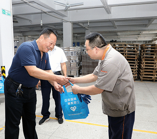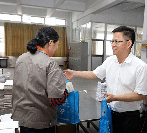 楊興國首先來到彩印分公司生產(chǎn)車間,看望了奮戰(zhàn)在生產(chǎn)一線的員工,向他們送上毛巾等防暑降溫物品,在炎炎夏日為大家?guī)硪还汕鍥觥钆d國叮囑員工們在堅守崗位、做好工作的同時,要樹牢安全意識、加強勞動保護,注意防暑降溫和疫情防控。