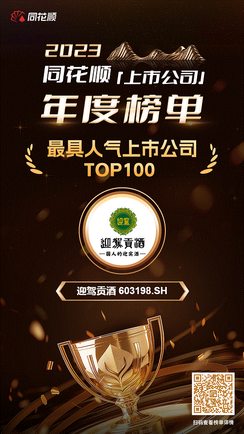 1月4日,2023同花順上市公司年度榜單正式公布,迎駕貢酒榮獲2023年度“最具人氣上市公司TOP100”獎項,董事會秘書孫汪勝榮獲2023年度“最受歡迎董秘TOP100”獎項。