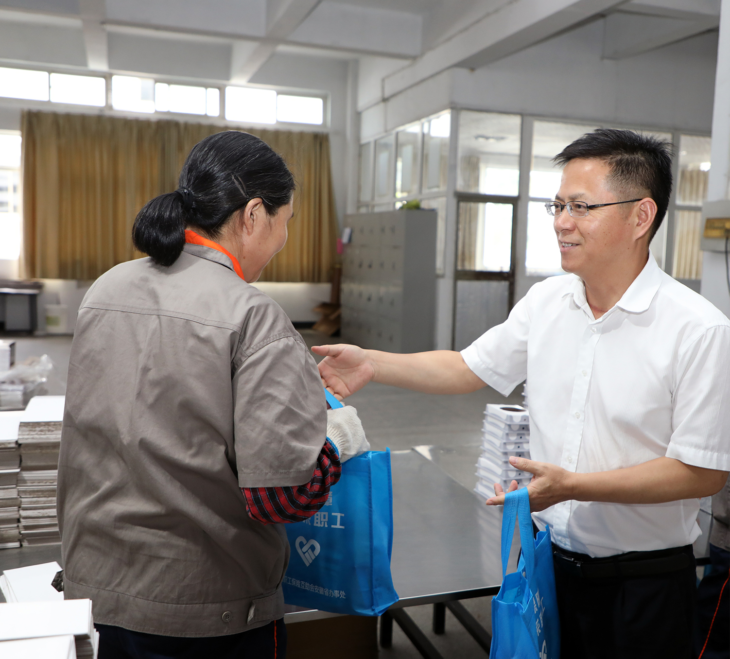8月9日,中國職工保險互助會安徽辦事處主任楊興國來迎駕開展“互助保障送清涼”慰問活動,六安市總工會黨組成員、副主席張儀,霍山縣總工會黨組書記、常務(wù)副主席楊繼祥,迎駕集團(tuán)副總裁、工會主席程培華等陪同慰問。楊興國首先來到彩印分公司生產(chǎn)車間,看望了奮戰(zhàn)在生產(chǎn)一線的員工,向他們送上毛巾等防暑降溫物品,在炎炎夏日為大家?guī)硪还汕鍥觥钆d國叮囑員工們在堅守崗位、做好工作